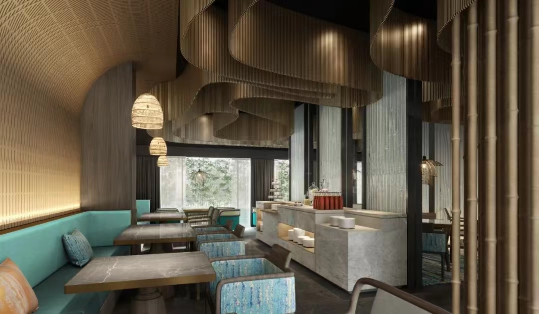 在规划的多人用餐区,色调的应用上,HHD假日东方设计选用棕黄色的基调作为主要色调,在其中又添加代表竹林的碧青色,让整体层次鲜明靓丽,竹子形成优美的弧舒展到天花顶部,好似女星摇曳的金色裙摆。在此用餐,如沐春风,温暖愉悦。
